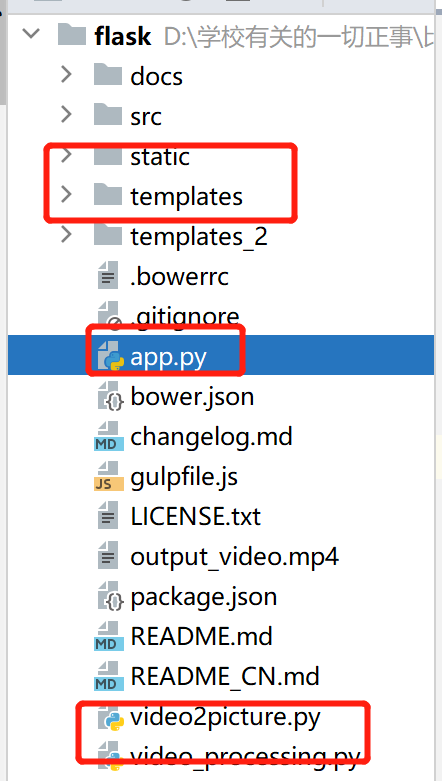 app.py :flask主要文件,用于发送一些请求,页面与py文件的中转站。通过头部文件连接同层级的py文件video_processing、video2picture ,里面对应的函数 process_video、get_first_and_last_frames。