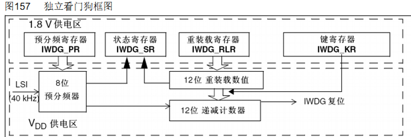 独立看门狗(IWDG)由专用的低速时钟(LSI)驱动,即使主时钟发生故障它仍有效