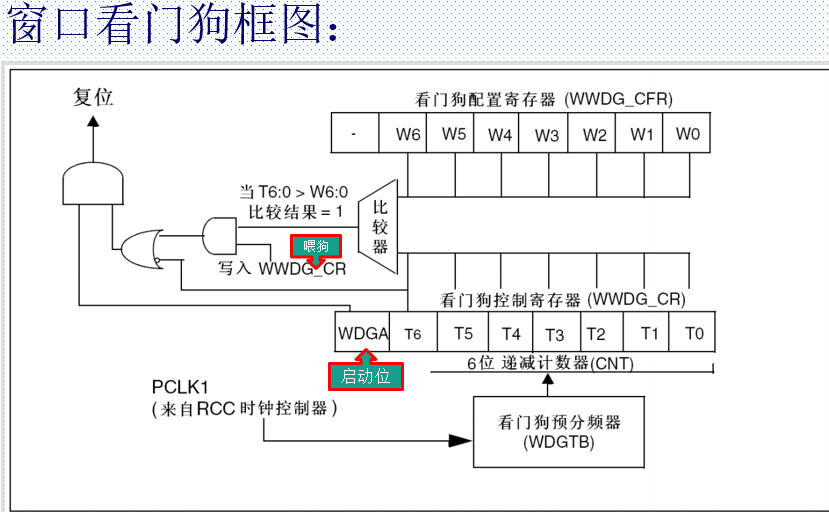 (1)当喂狗的时候如果计数器的值大于某一设定数值W[6:0]时,此设定数值在WWDG_CFR(配置)寄存器定义