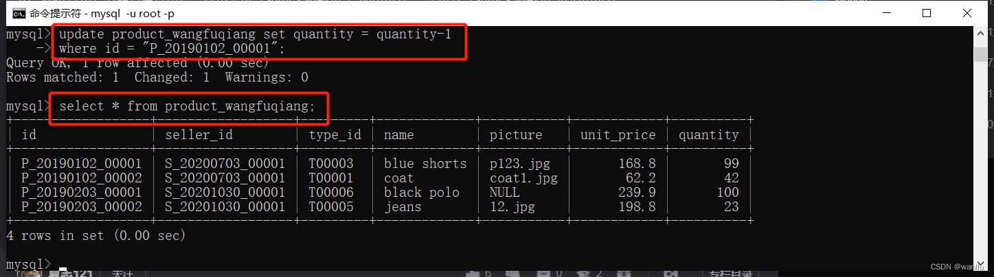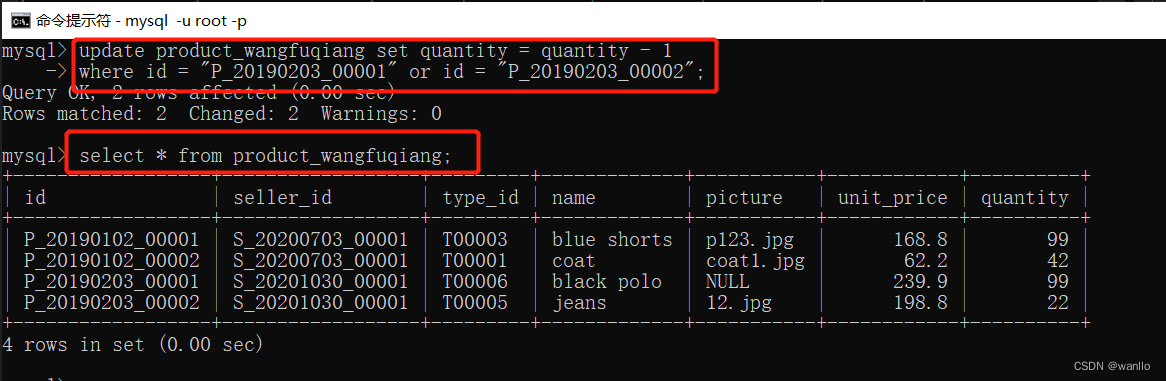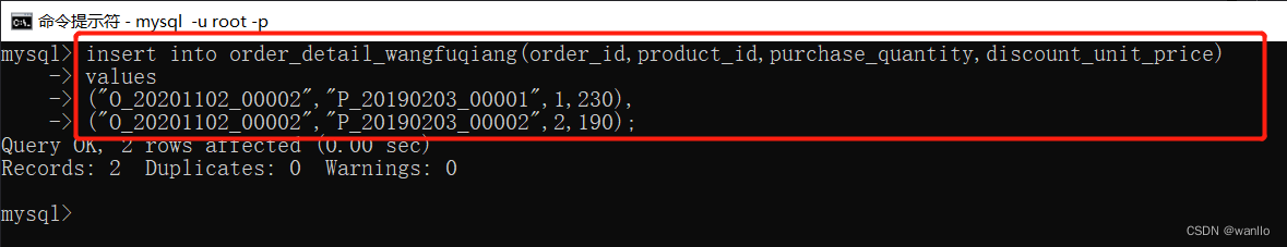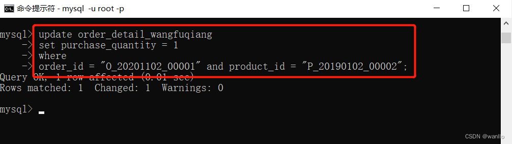 - 修改订单详情表中O_20201102_00001订单P_20190102_00002产品的采购数量为1