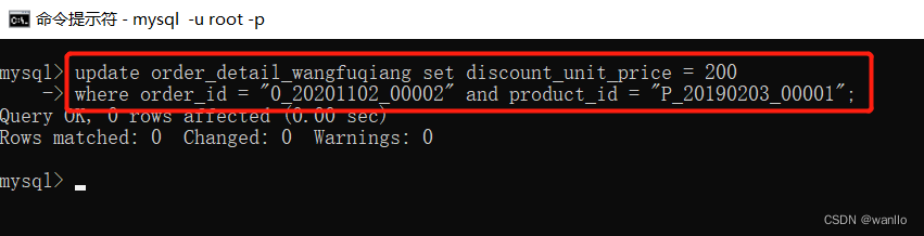 - 修改订单详情表中O_20201102_00002订单P_20190203_00001产品的折后单价为200