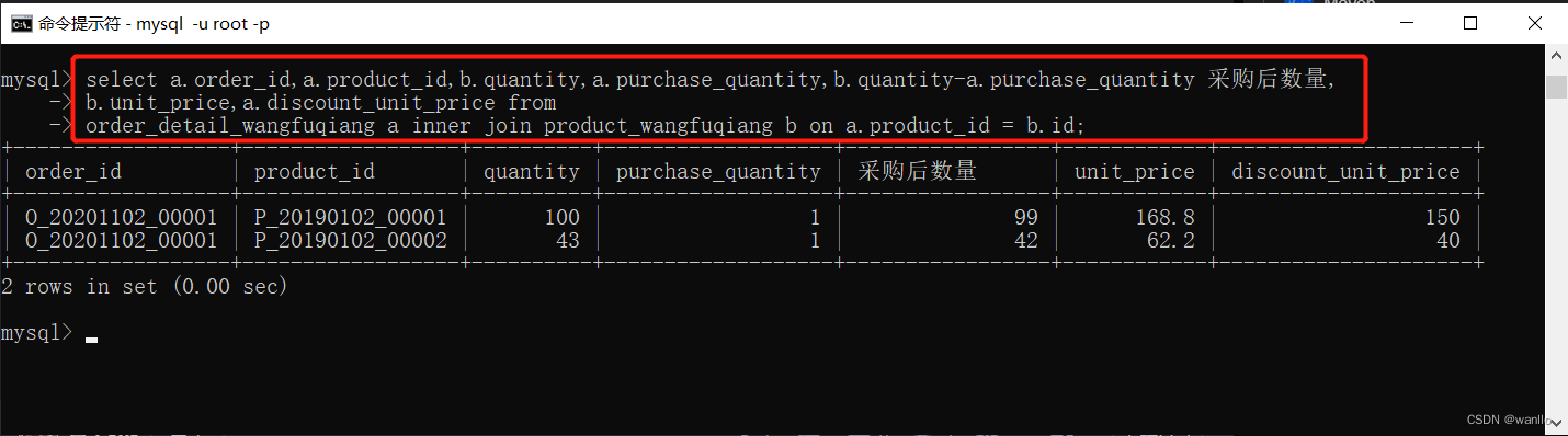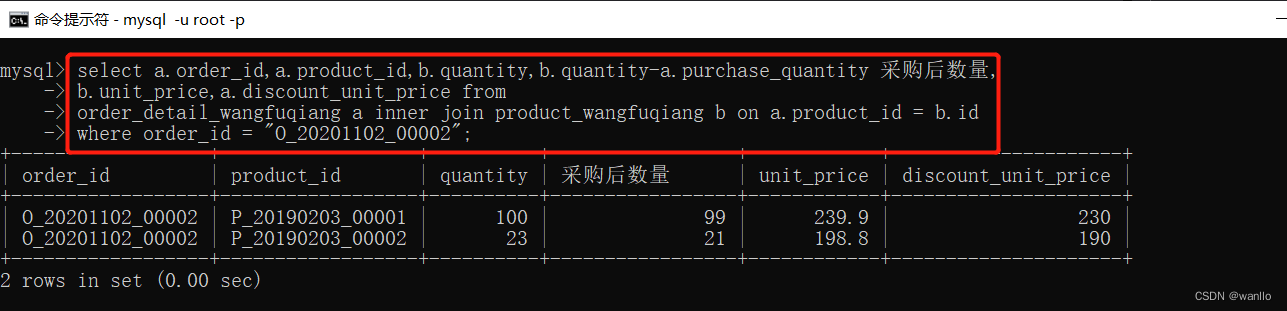 - 查看O_20201102_00002订单的订单编号、产品编号、库存数量、采购数量、采购后数量(库存数量-采购数量)、产品单价、折后单价