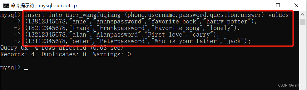 | 13812345678 | anne | annnepassword | favorite book | harry potter |