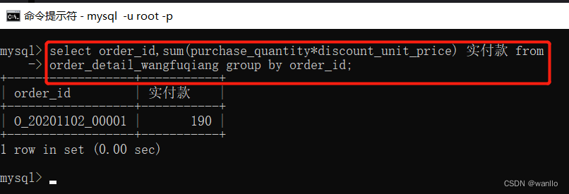 - 根据订单号分组查看实付款(sum(采购数量*折扣单价))