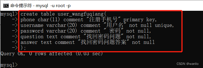 1.创建用户表“user_姓名全拼”,表中字段信息如下: