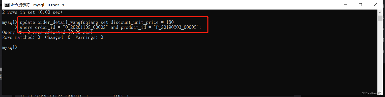 - 修改订单详情表中O_20201102_00002订单P_20190203_00002产品的折后单价为180