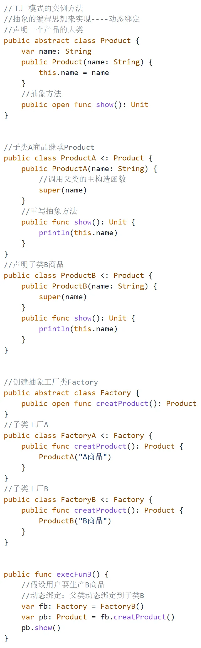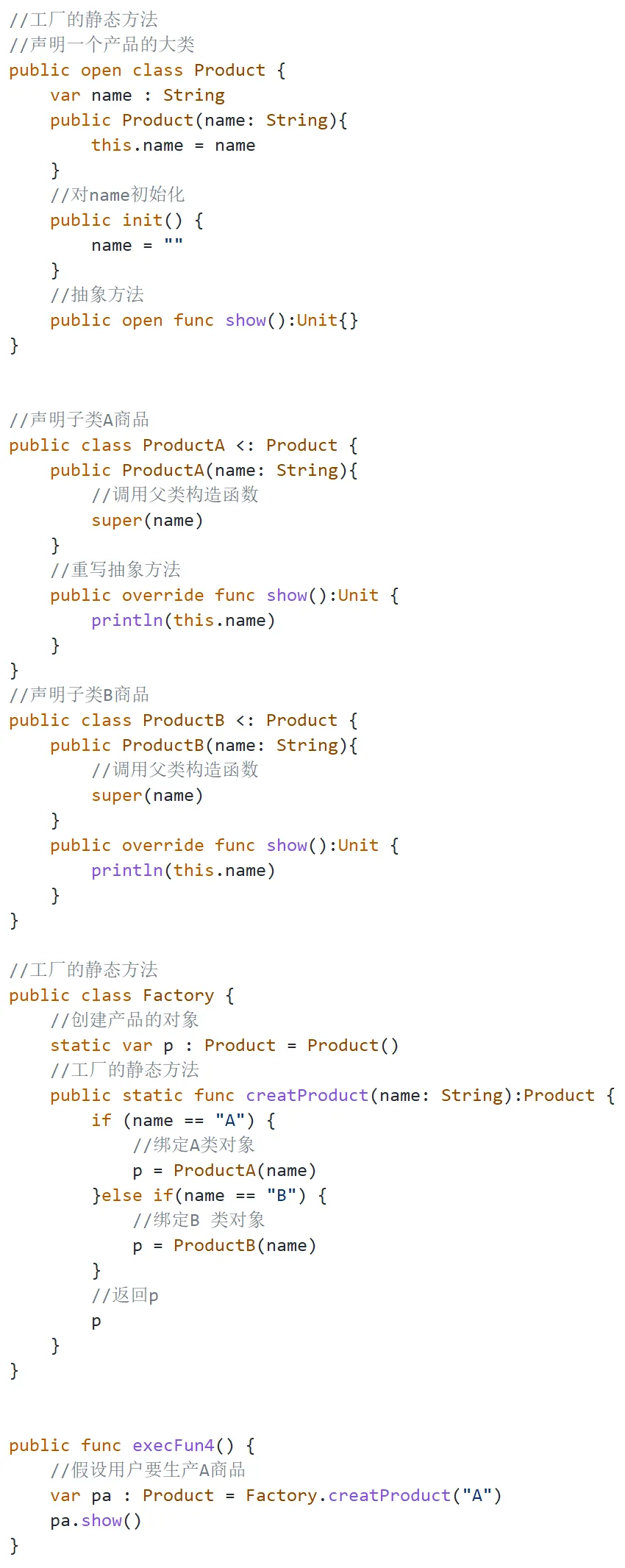 创建工厂的方法可以有实例方法和静态方法,场景为工厂A和工厂B分别生产A商品和B商品