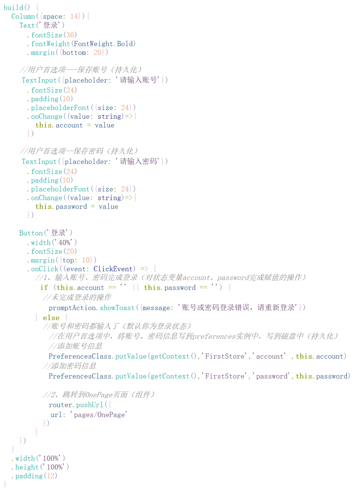 在应用加载页面时,会先读取磁盘中是否存在用户的账号和密码字段,如果存在,则说明为登录状态,无需再次登录,直接加载应用的而首页即可;若不存在,则说明为未登录状态,那么就先加载登录界面,登录成功后会跳转至应用的首页。