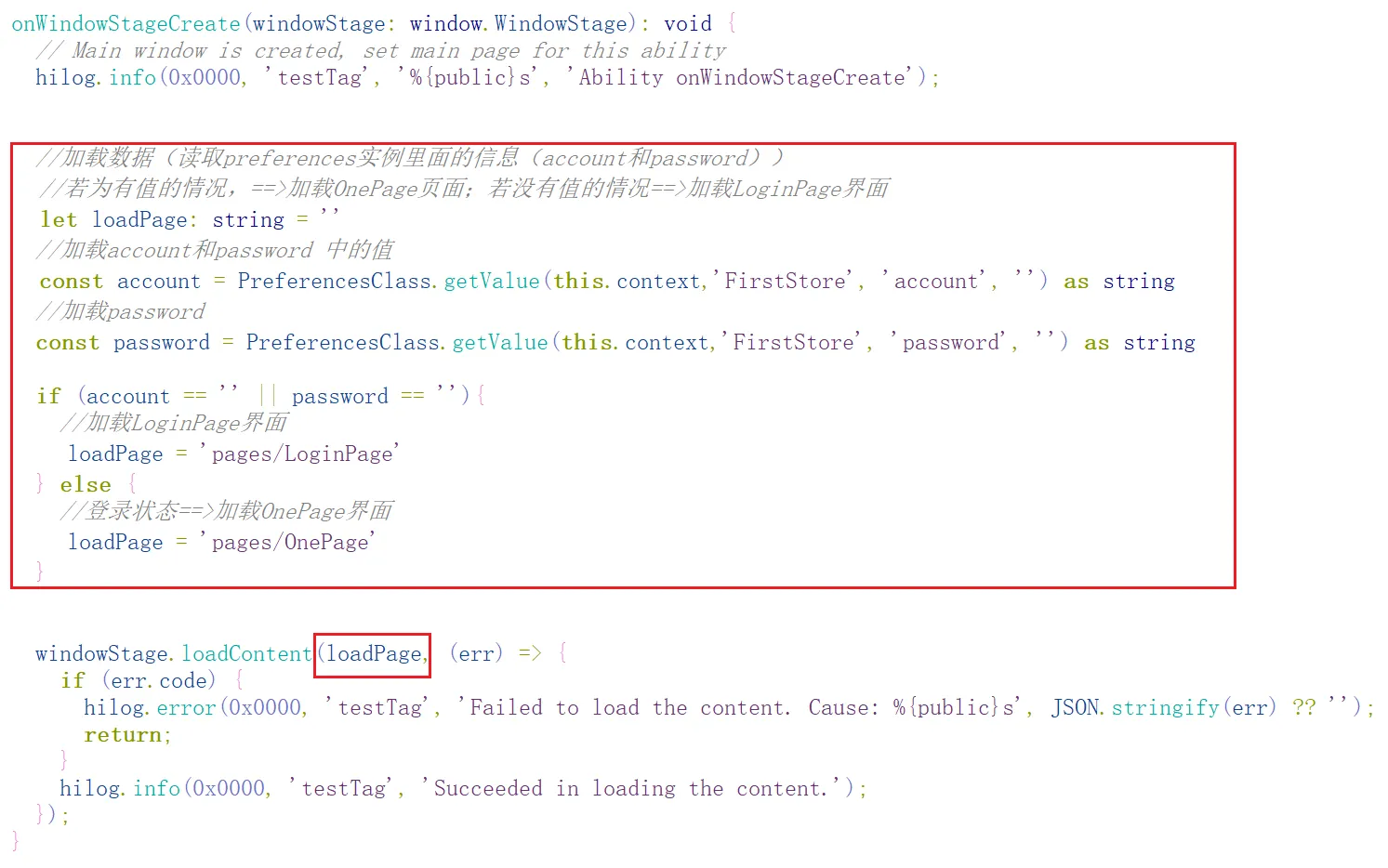 在EntryAbility文件中的onWindowStageCreate()方法中,创建变量loadPage,用于存储即将加载的页面的信息: