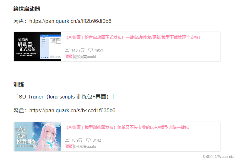 https://www.bilibili.com/read/cv21362202/?spm_id_from=333.999.0.0【AI绘画】模型训练器发布!简单又不失专业的LoRA模型训练一键包_哔哩哔哩_bilibili具体的训练操作步骤可以参考以前的教程 BV1fs4y1x7p2,训练界面只是把它可视化并且集成了tensorboard与打标,更加方便 百度盘:https://pan.baidu.com/s/1TBaoLkdJVjk_gPpqbUzZFw夸克盘:https://pan.quark.cn/s/b4ccd1f635b6AutoDL 云端使用教程:https://www.bilibili.com/rea, 视频播放量 759134、弹幕量 562、点赞数 40266、投硬币枚数 39475、收藏人数 35503、转发人数 3518, 视频作者 秋葉aaaki, 作者简介 喂饭区UP主,玩AI的 希望能为大家带来技术的乐趣~ 付费咨询在爱发电同名,商务:work@anzu.link 微博:秋葉aaaki,相关视频:【AI绘画】最佳画风/人物模型训练!保姆式LoRA模型训练教程 一键包发布,【AI绘画】深入理解Stable Diffusion!站内首个深入教程,30分钟从原理到模型训练 买不到的课程,Stable Diffusion 一键安装包,秋叶安装包,AI安装包,一键部署,【AI绘画】Stable Diffusion 最终版 无需额外下载安装!可更新✓ 训练✓ 汉化✓ 提供7G模型 NovelAI,【2024最新版SD教程】 秋叶大神Stable Diffusion安装包 零基础入门到精通SD教程 人工智能ARGC绘图 AI绘图 一键出图教程(含SD提),【AI绘画】ComfyUI整合包发布!解压即用 一键启动 工作流版界面 超多节点 ☆更新 ☆汉化 秋叶整合包,【AI绘画】绘世启动器正式发布!一键启动/修复/更新/模型下载管理全支持!,【Stable Diffusion 2024教程】全网最良心最全的SD全套106集,零基础到精通教程!软件使用安装+实战案例全流程教学!持续更新中~,【AI绘画】4月模型推荐榜 大模型/LoRA 看看AI都能画出哪些东西了?,【LoRA】 全网最详细LORA模型训练教程,教你玩转LORA,学完你就是最强炼丹师! Stable diffusion基础 AI绘画 (附SD安装包