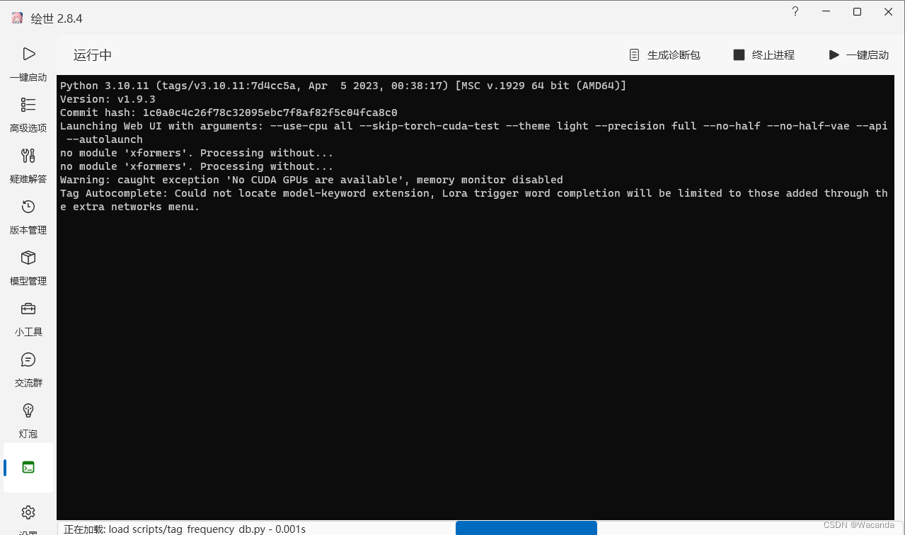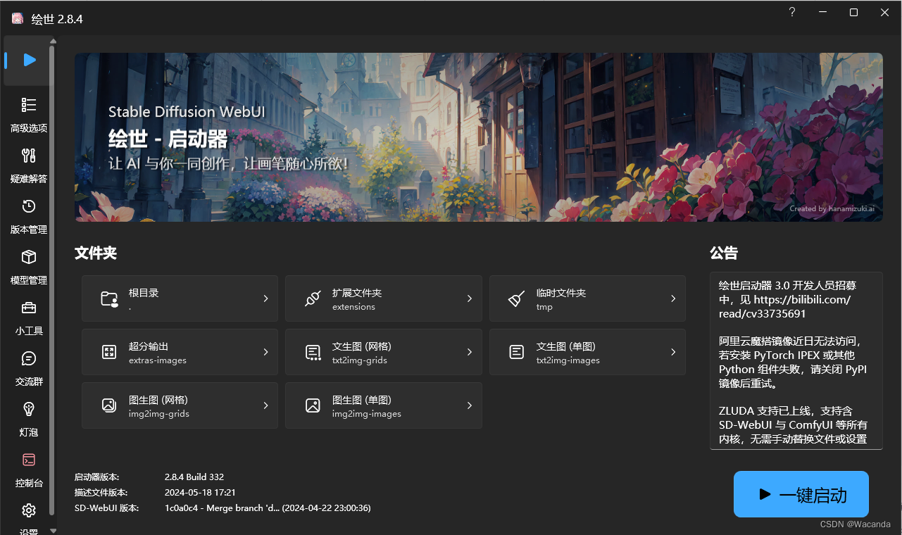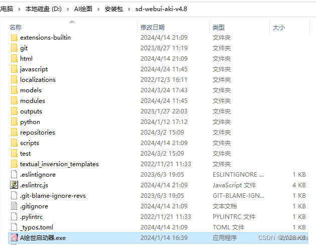 在 sd-webui-aki-v4.8 文件下找到 A绘世启动器.exe 点击加载,第一次加载会比较慢。