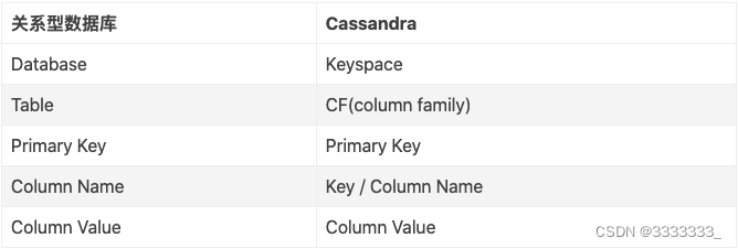 Keyspace::用于存放 ColumnFamily 的容器,相当于关系数据库中的 Schema 或 database。