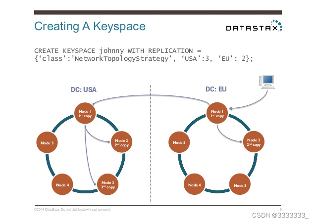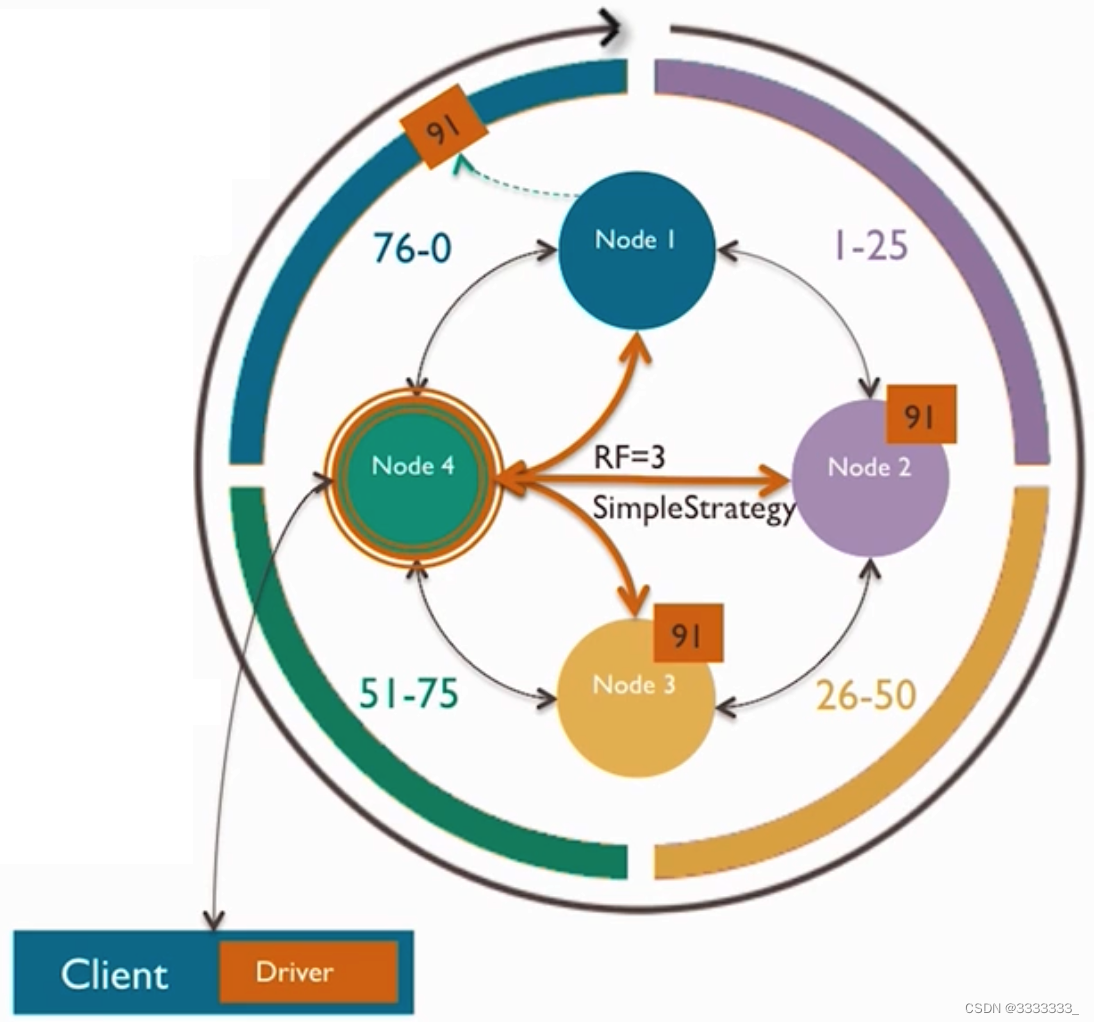 - SimpleStrategy:仅用于单数据中心,将第一个replica放在由partitioner确定的节点中,其余的replicas放在上述节点顺时针方向的后续节点中。