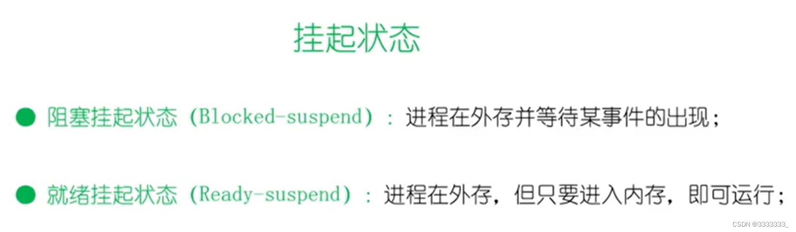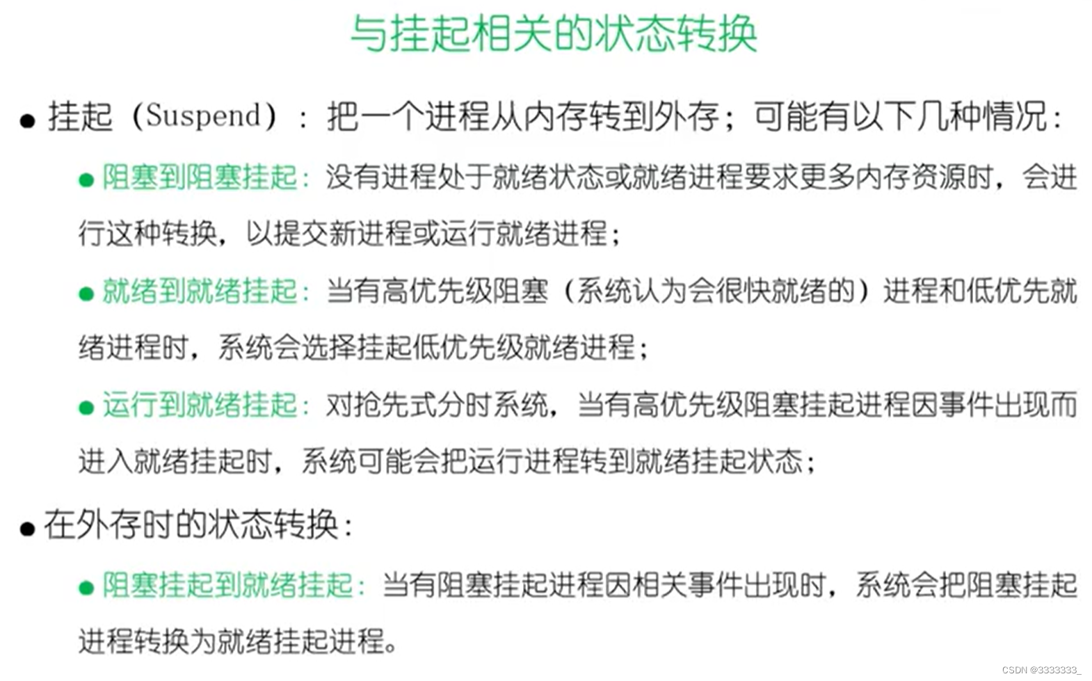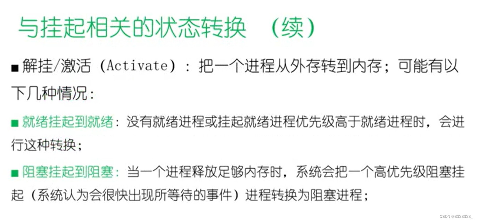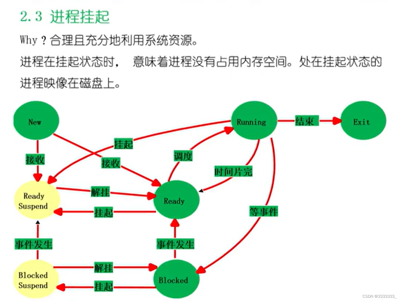 因为当处于阻塞挂起这个状态的进程,随着操作系统的执行,这个阻塞进程所需要的事件,所需要的资源得到了满足,之后,进程状态就应该变成了就虚太,但是由于这个进程本身还挂起在硬盘上面,所以这时候只是把阻塞挂起变成了就绪挂起,但是进程本身所有的资源,所有内存的数据,都还是存在硬盘上的,我们只是把状态变了下。