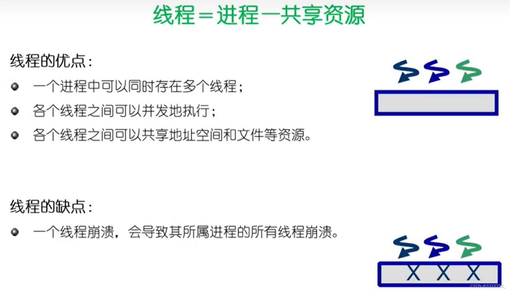 线程,它的有点就是它的缺点,既然它都开共享了,那如果一个线程写错了,它就有可能破坏其他线程所共享的进程资源,因为线程可以访问进程中所有资源,比如它把数据破坏了,其它线程也需要这个数据,其他线程,就可能出现崩溃的现象。它的缺点就是安全可靠性没有保障,一个线程崩溃,其他线程全完蛋,进程也就结束了。