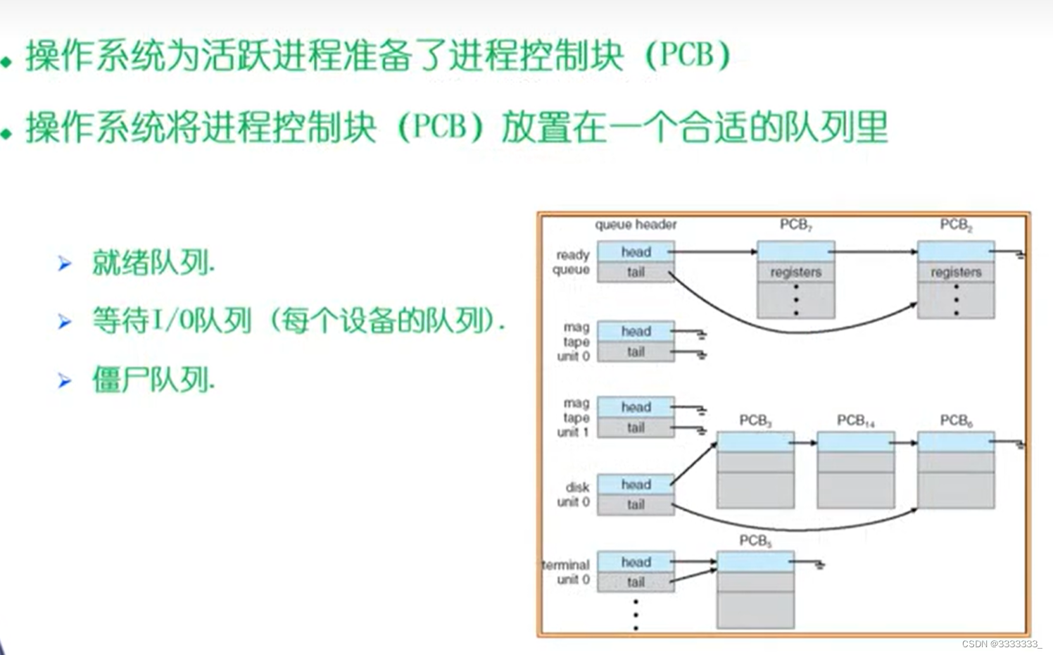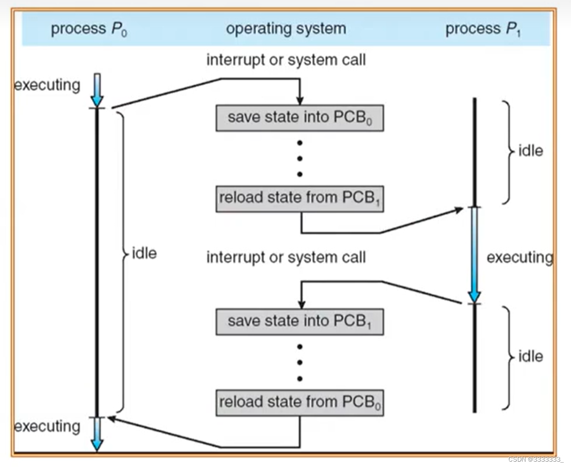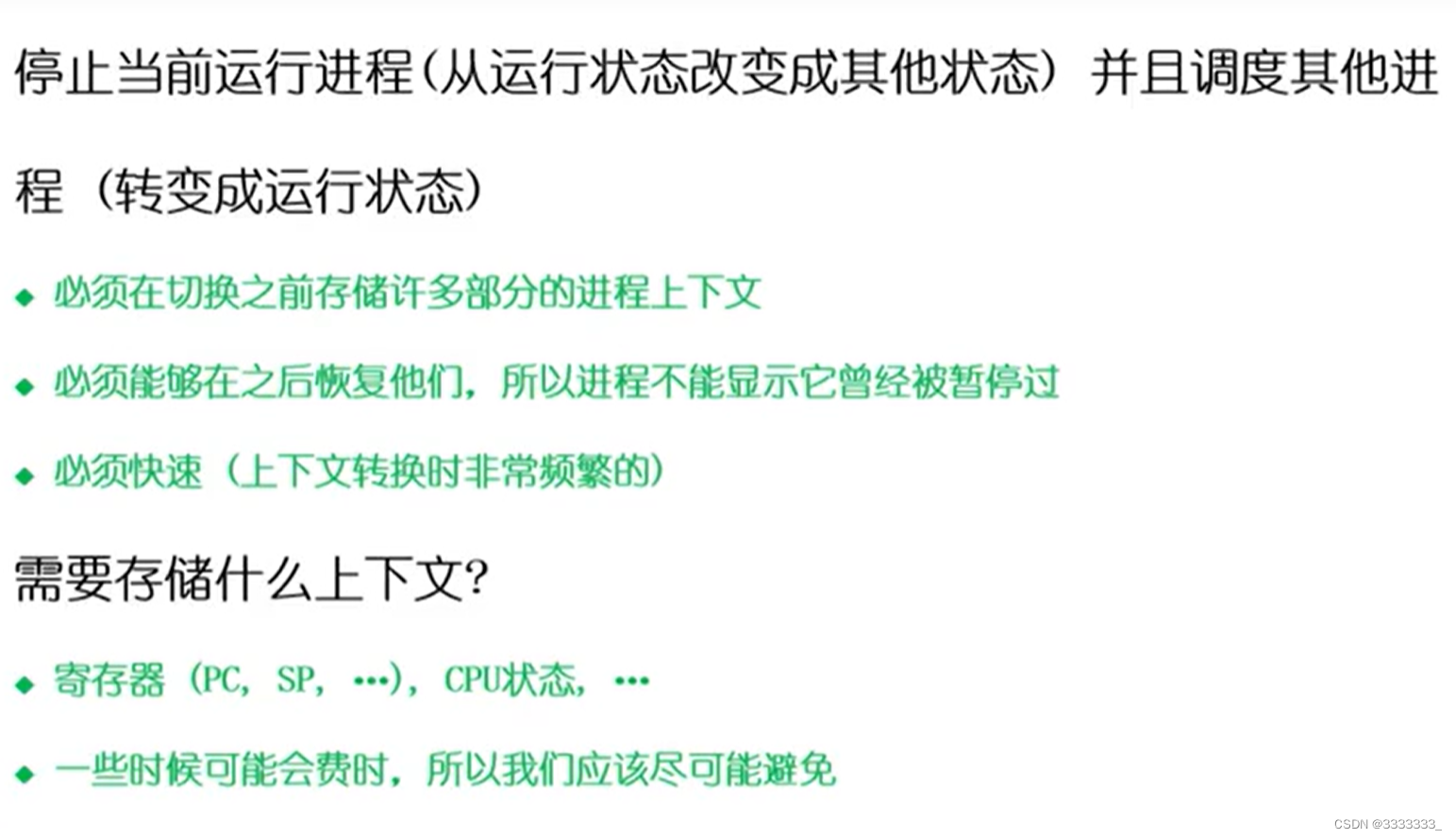 这些信息在做进程切换的时候,需要把这些信息保存到进程控制块中的某个位置,保存之后呢,当运行另外一个进程的时候,需要把这个寄存器从那个进程控制块中取出来,甚至context这么上下问取出来,然后恢复到CPU里面去,相当于把寄存器的资源重新赋好,这使得我们接下来这个进程可以继续在CPU上执行,