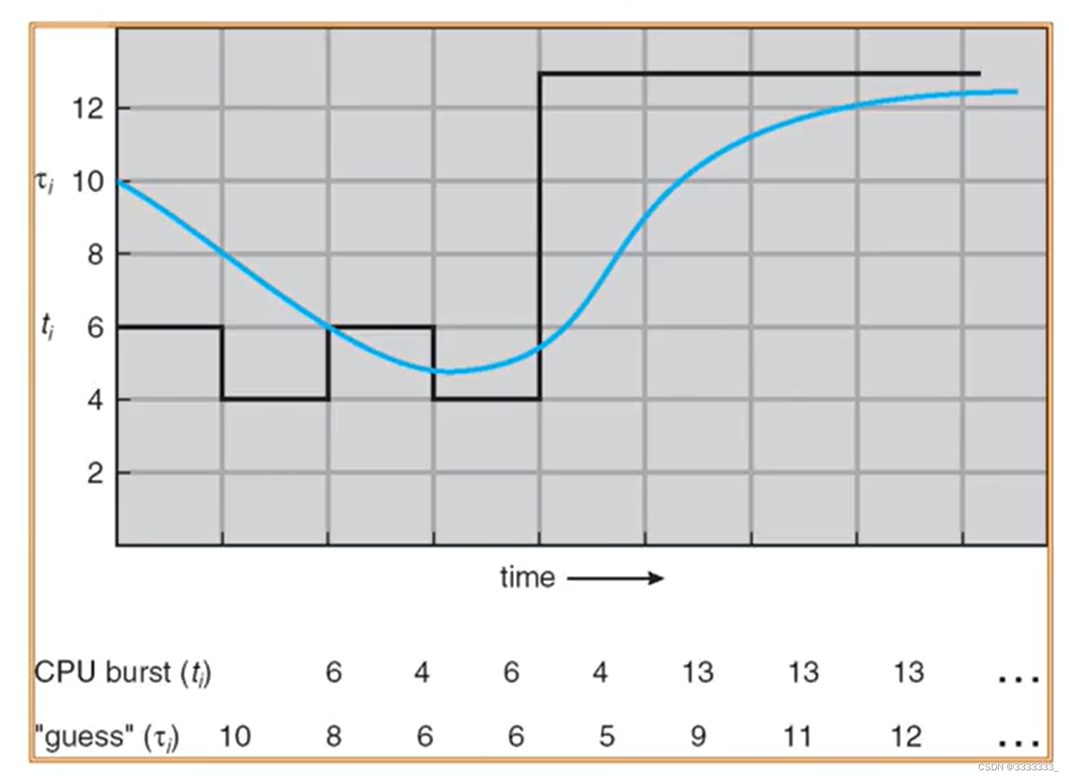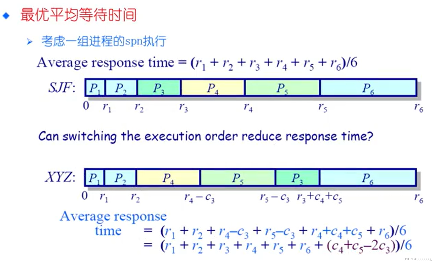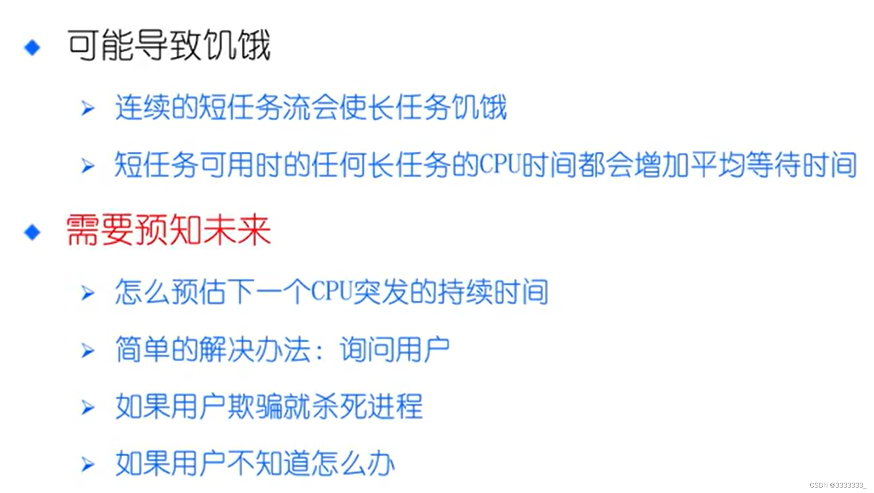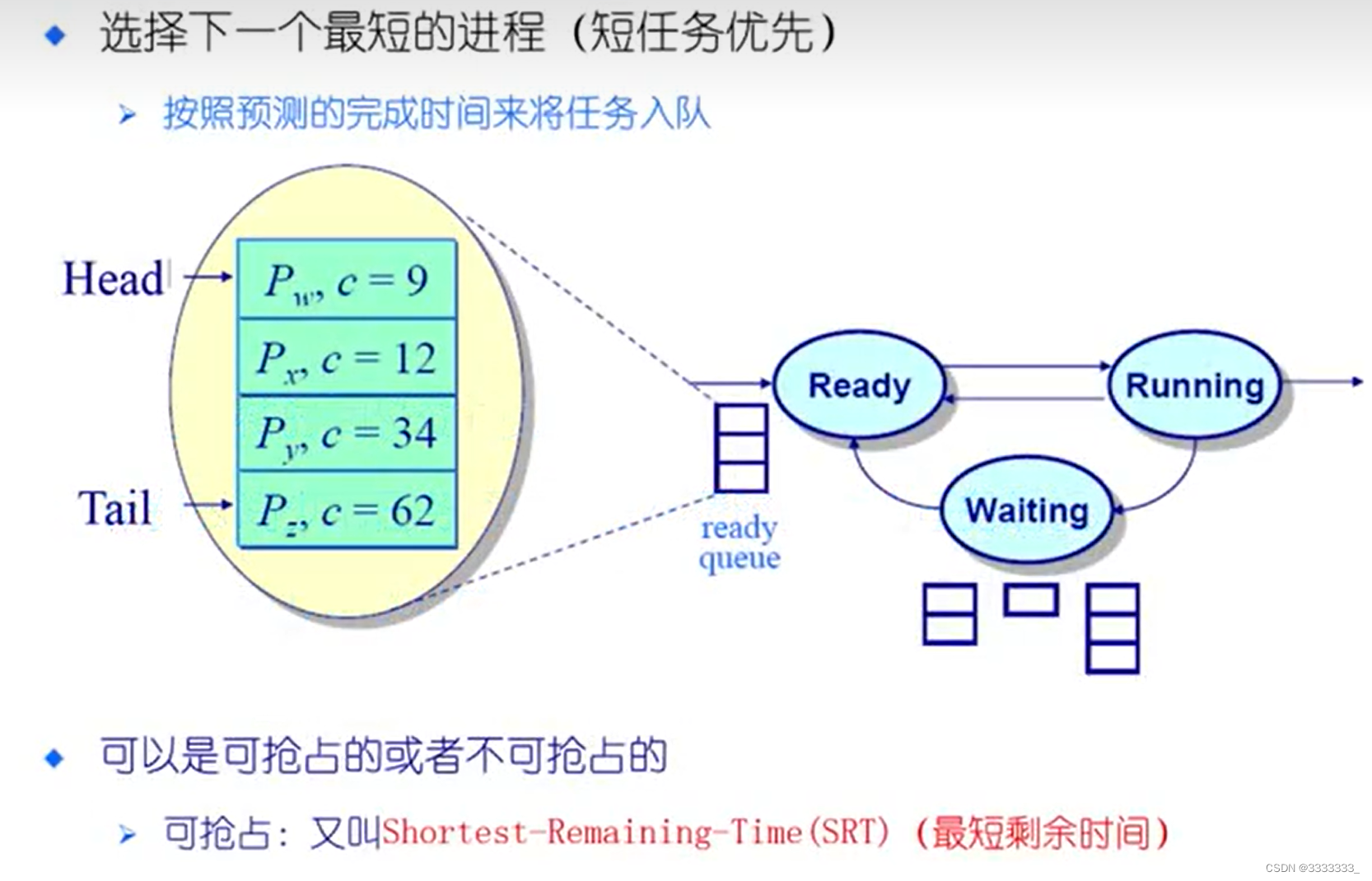 2 抢占式的,就是说,当Pw在执行的时候,比如执行完一个时间片,还剩余执行事件8(之前是9),这是来了一个新进程,执行时间是5,比较下正在执行的剩余时间和这个新的进程执行时间,新进程执行时间更小,它剩余的时间只有5,虽然它没有被执行,这个时候就要完成一次抢占,当前正在运行的进程从运行态-》就绪态,重新放回就绪队列里面去,让新进程占用CPU继续执行。
