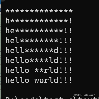 上述代码打印结果是一瞬间的。经过下述改良之后,打印结果有时间间隔,且会清理上次打印结果,给人一种逐步打印的感觉,也展示了多个字符从两端移动,向中间汇聚的整体过程。宝宝们下来可以尝试一下。