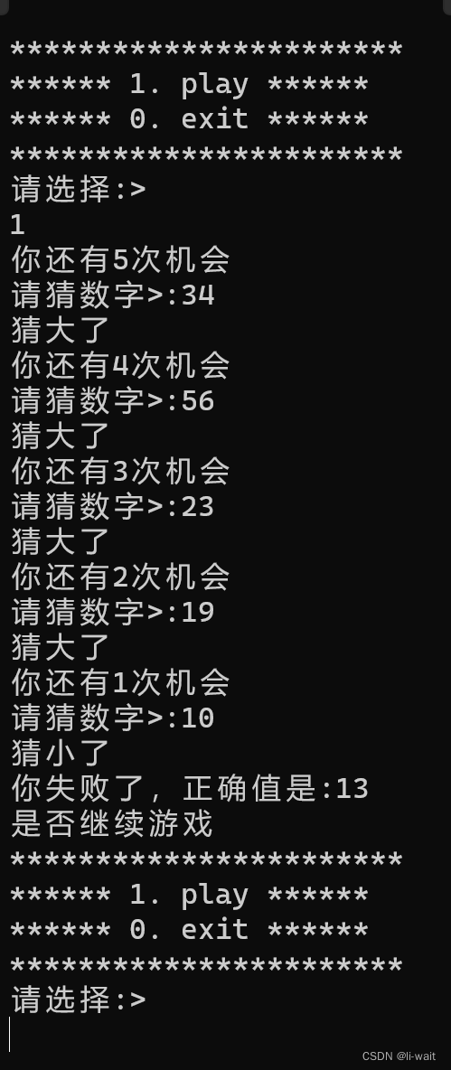 2. 玩家猜数字,猜数字的过程中,根据猜测数据的大小给出大了或小了的反馈,直到猜对,游戏结束。