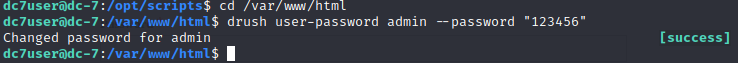 发现能运行drush命令,drush命令可以更改密码,在/var/www/html目录下运行drush命令,更改admin的密码。