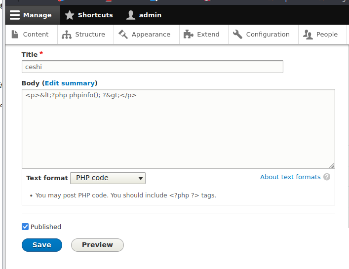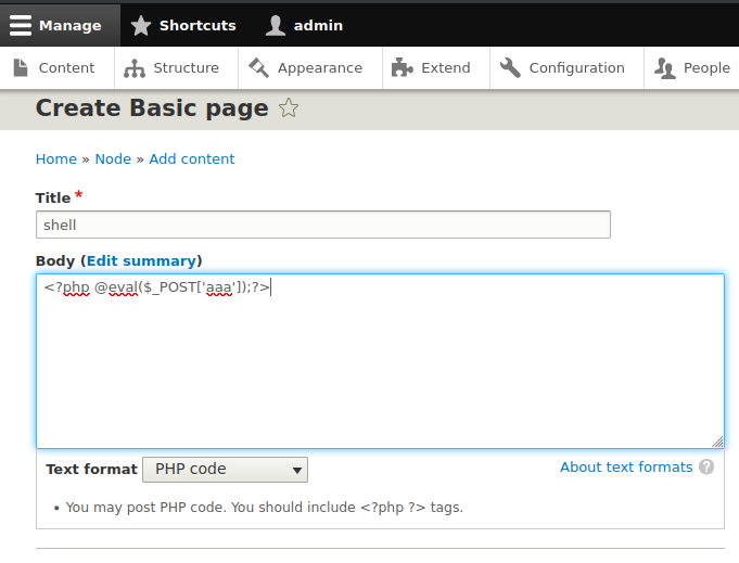在Content中添加一句话木马,依次点击:content(内容)→add content→basic page(为静态内容使用基本页面),测试添加,命名为ceshi。选择format为php code。