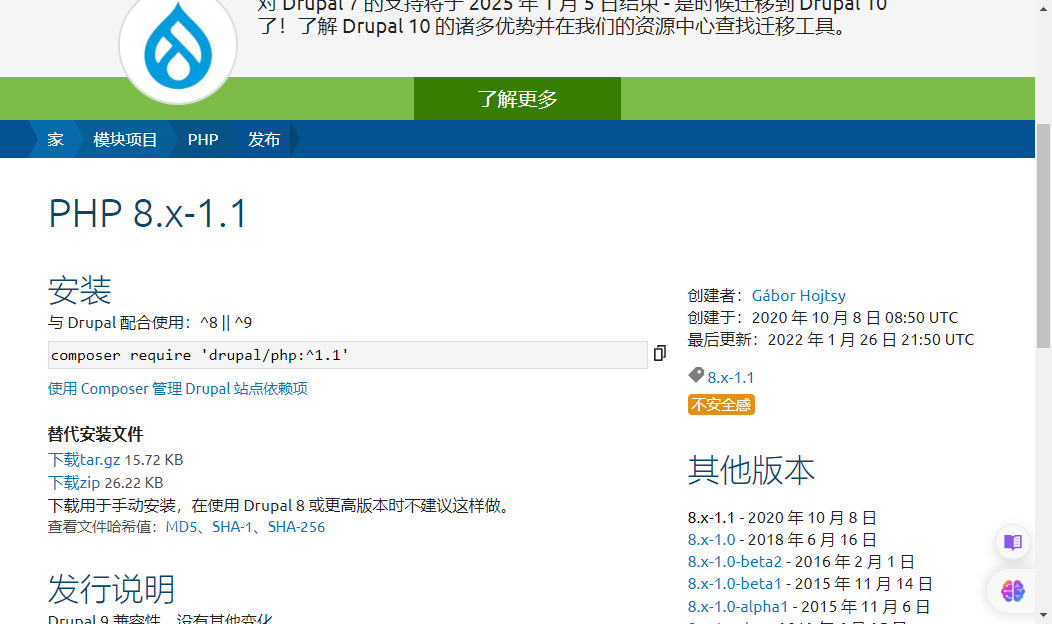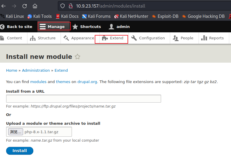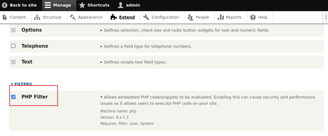 dc7的CMS是Drupal8,已经移除了PHP Filter(php过滤器),后续作为一个模组存在,可以手动安装。在官网找到下载链接,下载之后给 DC-7 安装