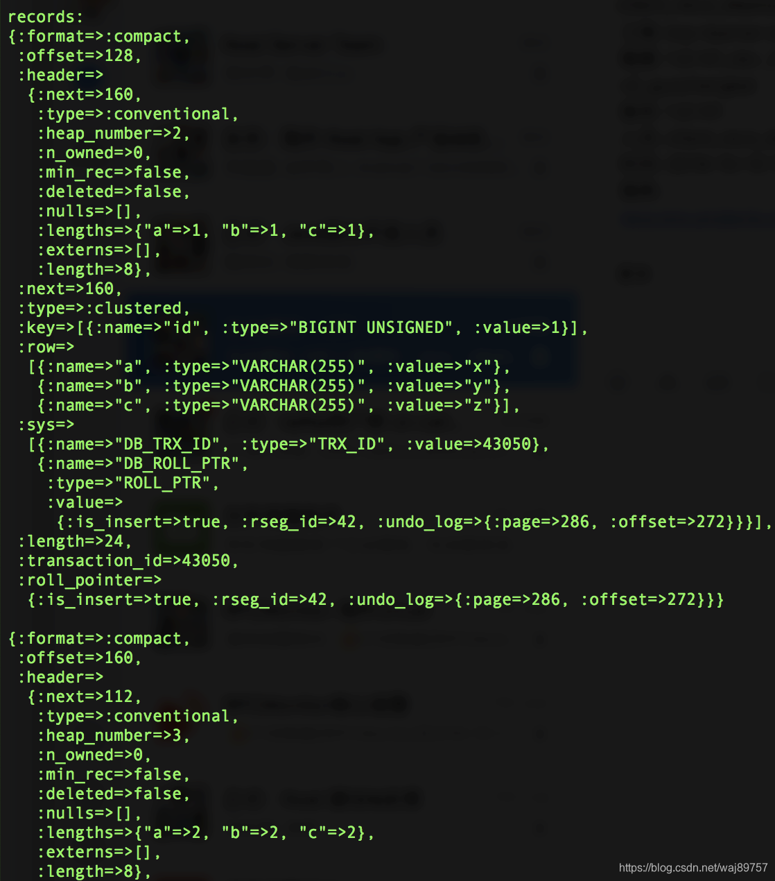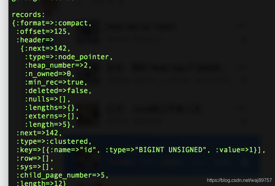 我们看聚簇索引存了什么东西:说几个重点结构,1.page header里的level=0 说明是叶子节点 2. records这个结构,几个关键字段 type = clustered 代表是数据行、 offset、next;可以看出是链表方式组织的结构。