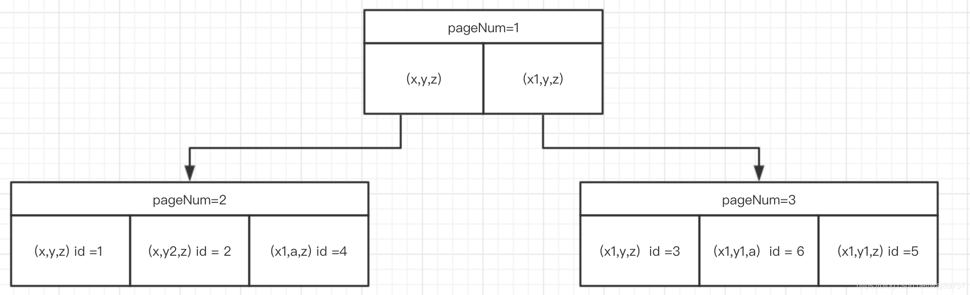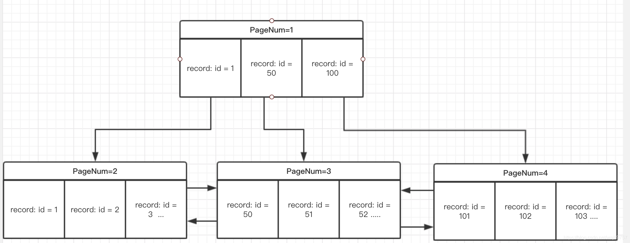 举个例子,比如要查 id = 55;根据结构先找到level =1 (只会有一个page节点)的page,然后遍历record找到第一个小于等于5的record,它的child_page_num指针会告诉下一层page页,找到后再遍历record链表 即可找到记录。