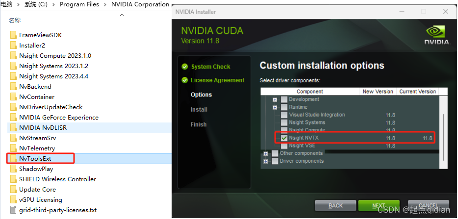 本地装的CUDA版本是12.X,装完以后C:\Program Files\NVIDIA Corporation路径下缺少NvToolsExt文件夹,通过安装CUDA11.8版本仅勾选Nsight NVTX 选项解决。