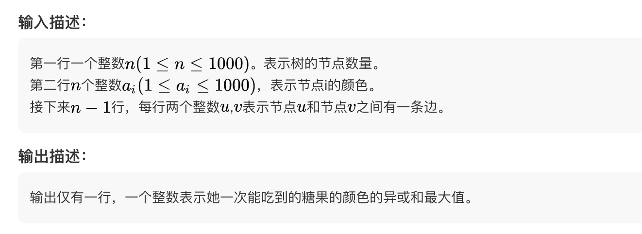 牛牛吃糖果有一个习惯,她每次都会吃掉一整个子树的糖果,她喜欢与众不同,所以每次吃之前她都会把出现次数最多的颜色的糖果扔掉(可能有多个出现次数最多的颜色,此时要全部扔掉),她可以选择任意一棵子树吃掉,但她只能吃一次,因此他想知道她一次能吃到的所有糖果的颜色的异或和最大是多少(如果吃到了多个颜色相同的糖果,也需要做多次异或),你能帮帮她吗?