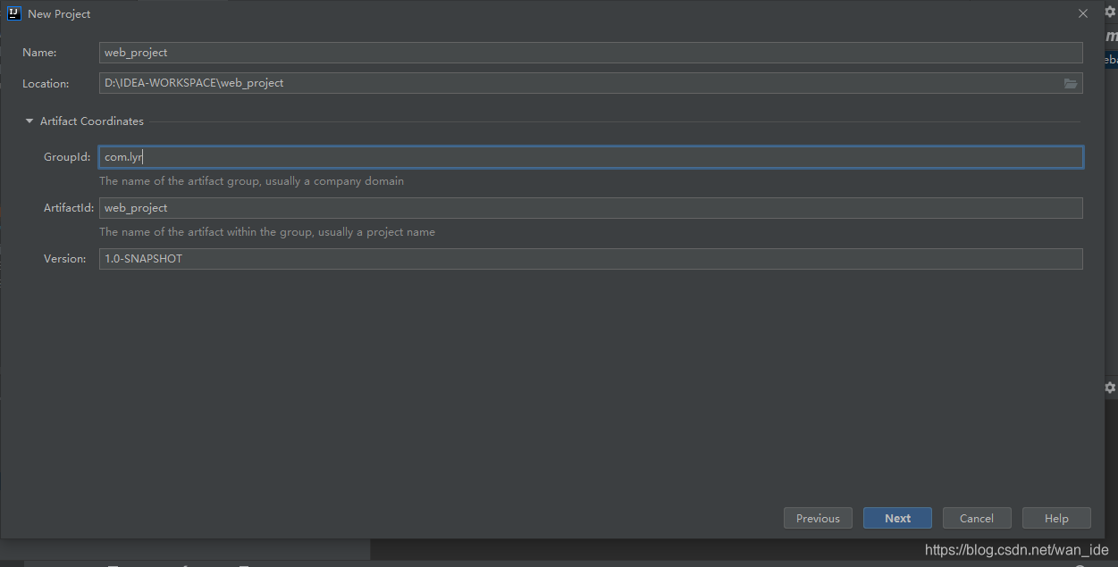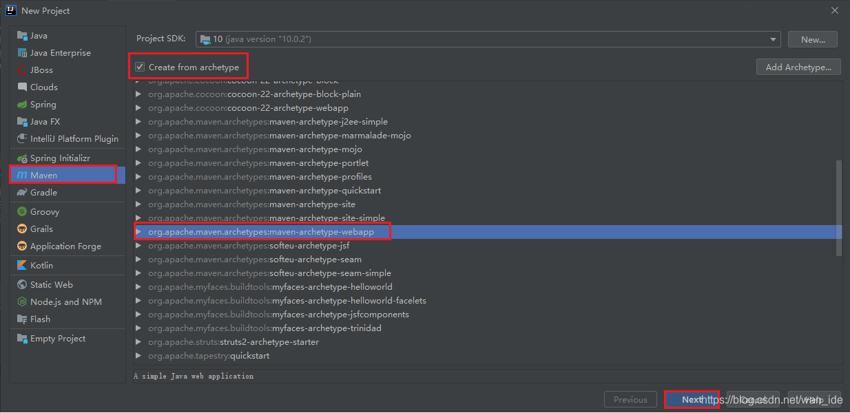 打开IDEA,File->New->Project,选择创建Maven项目,选择webapp的骨架,然后下一步。