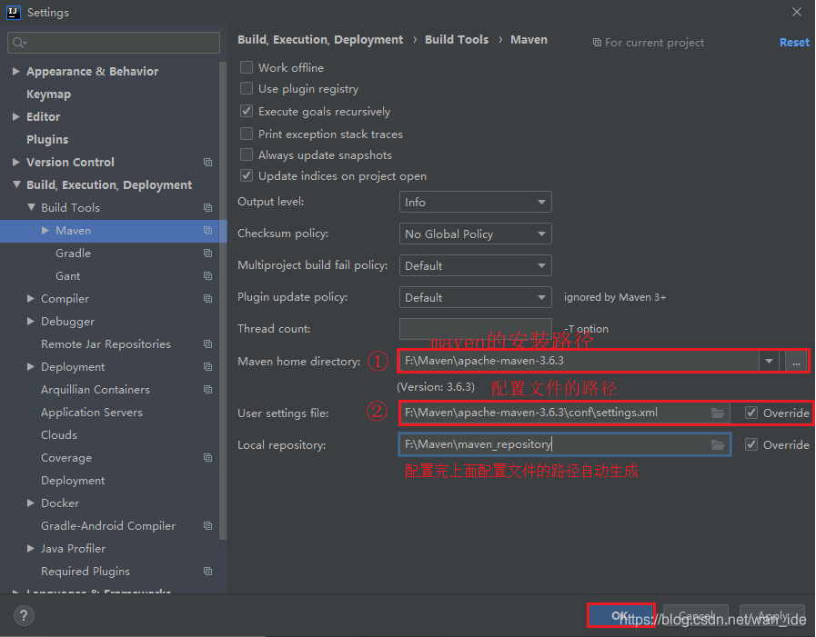 首先,①设置的是我们maven的安装路径,②是maven中配置文件的路径(conf->settings.cml),一般设置完②下面那项就会自动设置好,如果没有自动设置好,可以自己手动选择一下本地仓库,然后apply,OK就好了。