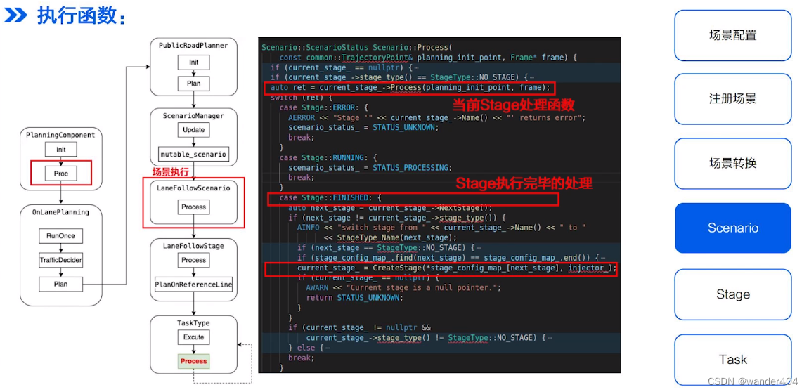 本文详细描述了工程框架中场景配置、场景注册与转换的过程,以及Scenario和Stage类的执行逻辑,特别关注了Task的执行函数,展示了如何通过Stage的Process方法调用Task来处理场景中的任务.