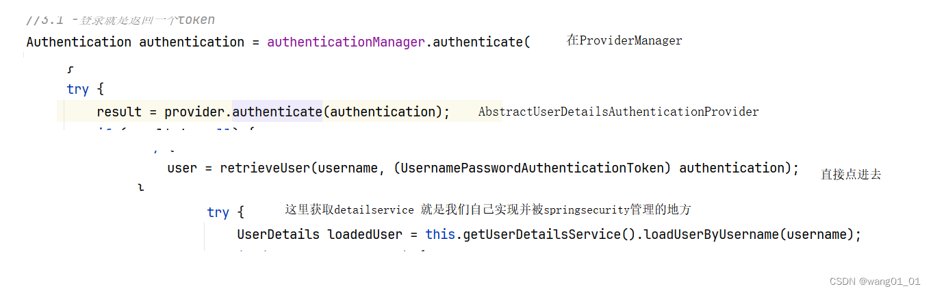 authenticationManager.authenticate() 传入我们的用户名密码,然后springsecurity就会帮我们往下进行验证