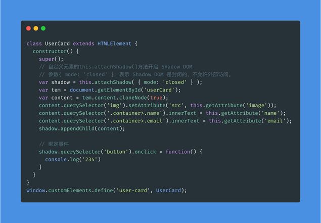 3. 如果需要的话,使用Element.attachShadow() 方法将一个shadow DOM附加到自定义元素上。使用原生的DOM方法向shadow DOM中添加子元素、事件监听器等。
