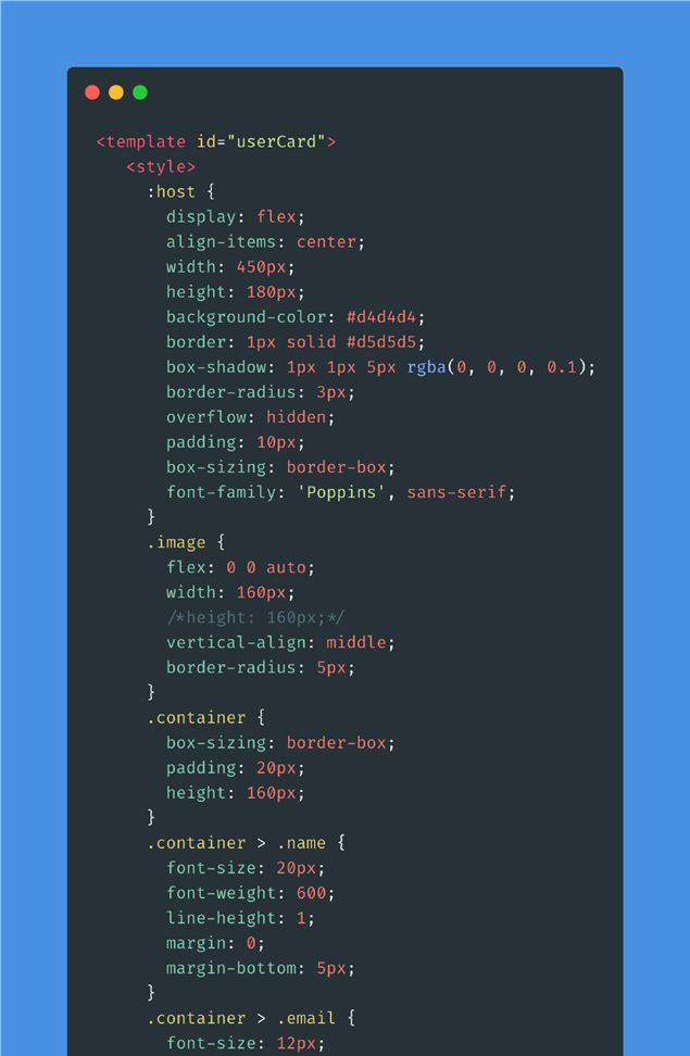 - 如果使用原生js来创建组件,我们的开发效率会大打折扣,达不到我们想要的组件化提升效率的目的,所以浏览器提供了template来创建元素,重新写一下样式代码。