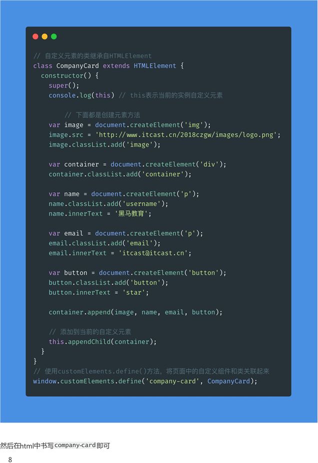 2. 自定义的元素需要使用js类来创建,页面中所有的自定义元素都会是这个类的实例: