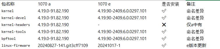 | 包名称 | 1070 a | 1070 e | 备注 |