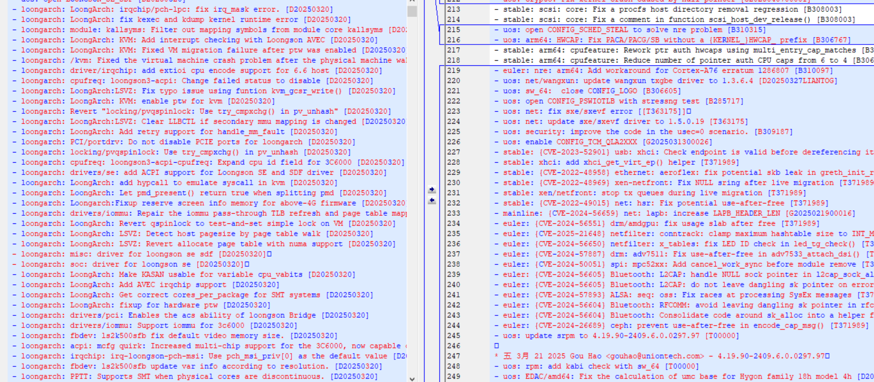 最后我还对比了一个两个内核版本的changlog,发现1070a 何如了一堆loongarch架构相关的补丁,但是e版本就没有,1070e版本合入了一些anolis相关的特性,但是1070a版本基本没有合入euler相关的特性,另外在1070e看到了一些CVE相关补丁大约有1400多个,但是1070a只有大约400多个,这个会不会可能做a版本小哥哥小姐姐比较懒忘了写changlog,这个对比表格就不放出来了,嘿嘿