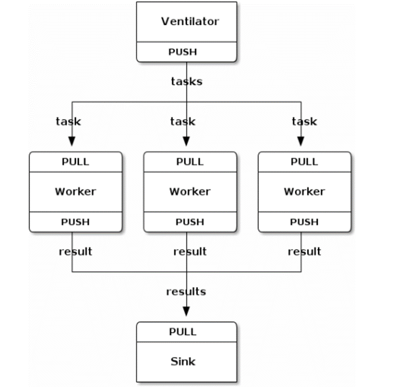 管道模型。这个模型里,管道是单向的,从PUSH端单向的向PULL端单向的推送数据流。这种模式与pub/sub模式一样都是单向的,区别有两点: