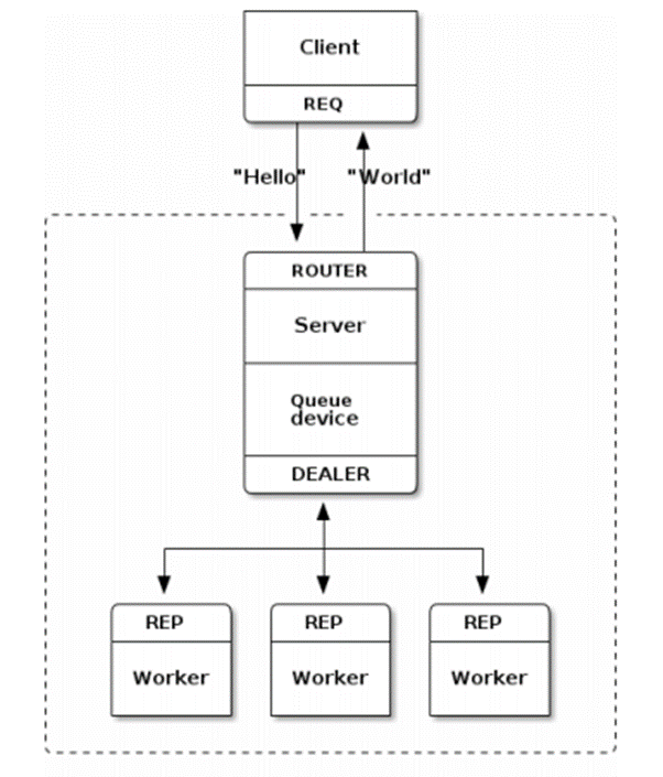 还有一种特殊的Request-Reply模型,它在Request-Reply模型上加了一层router-dealer,如下图所示: