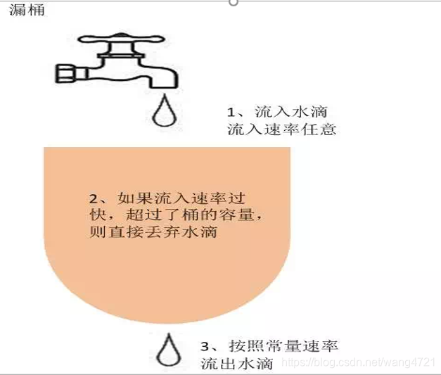 漏桶算法是访问请求到达时直接放入漏桶,如当前容量已达到上限(限流值),则进行丢弃(触发限流策略)。漏桶以固定的速率进行释放访问请求(即请求通过),直到漏桶为空。