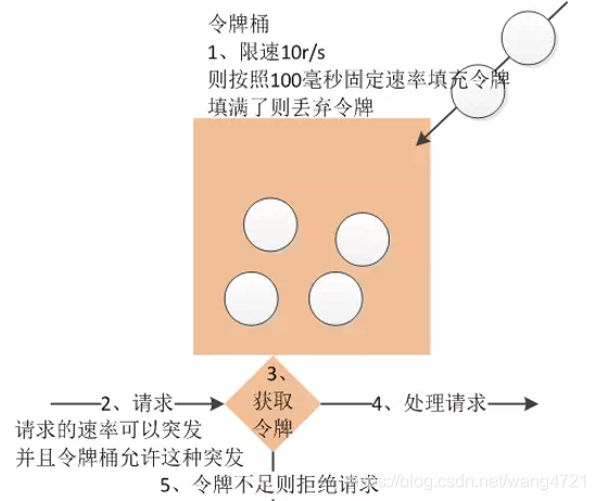 令牌桶算法是程序以r(r=时间周期/限流值)的速度向令牌桶中增加令牌,直到令牌桶满,请求到达时向令牌桶请求令牌,如获取到令牌则通过请求,否则触发限流策略