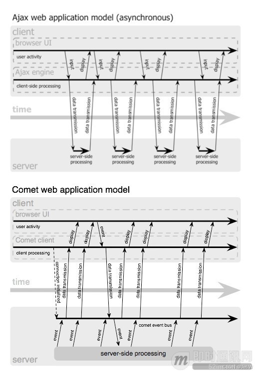 以下是典型的Ajax和Comet数据传输方式的对比,区别简单明了。典型的Ajax通信方式也是http协议的经典使用方式,要想取得数据,必须首先发送请求。在Low Latency要求比较高的web应用中,只能增加服务器请求的频率。Comet则不同,客户端与服务器端保持一个长连接,只有客户端需要的数据更新时,服务器才主动将数据推送给客户端。