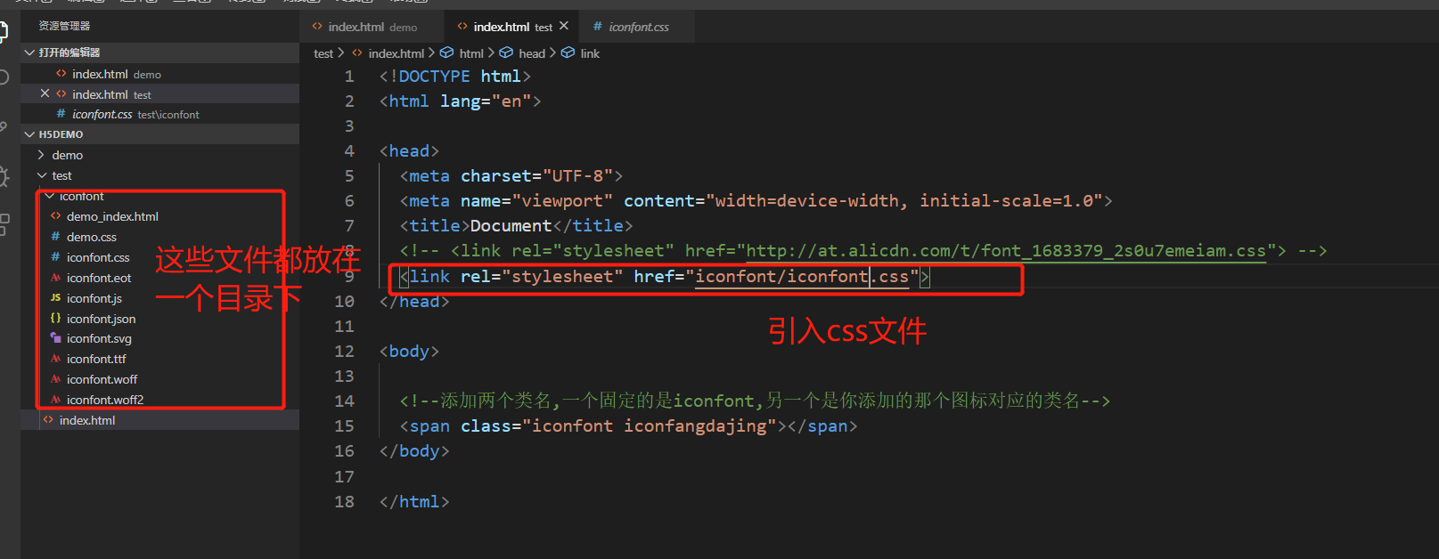 将这些文件放入同一个目录中,然后在页面引入iconfont.css