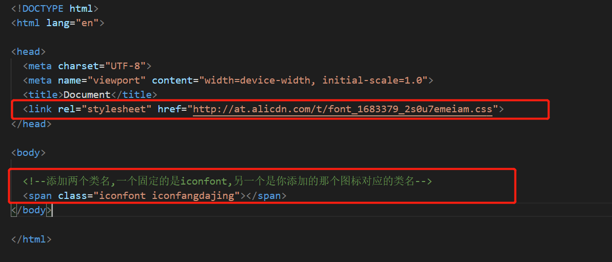 步骤五.在页面中引入生成的字体文件(分为2种,一种是直接引用线上的地址,另一种是将字体文件下载到本地)