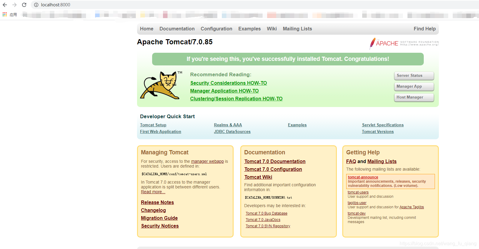 打开浏览器访问 localhost:8000,发现访问的内容不再是Nginx的首页而变成了tomcat的首页(这就说明反向代理配置成功了)