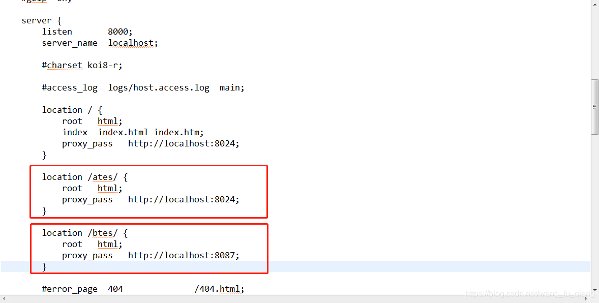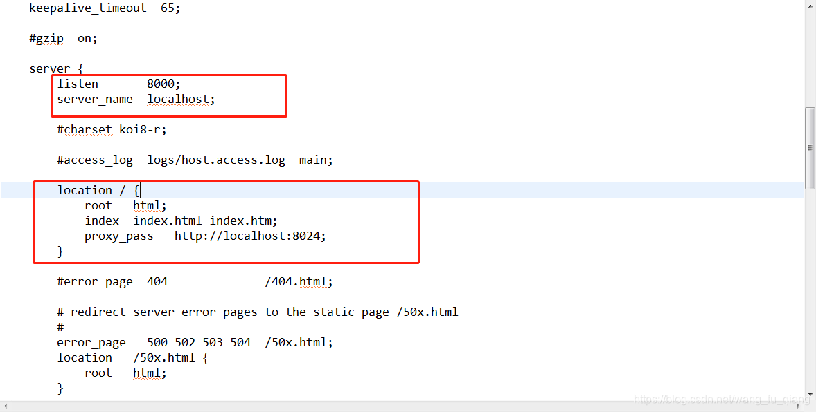 可以看到,修改了Nginx端口,location增加了配置proxy_pass http://localhost:8024;