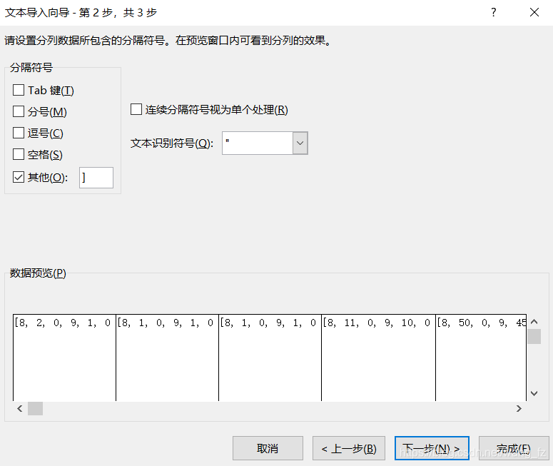 当然,上图中只是截取了数据的一小部分,像这样的数据直接读入matlab是不太好处理的,所以下面我们用Excel进行一下处理,首先需要利用分隔符号将数据分在不同的单元格中,我们观察上图中的数据,都是有规律的,用Excel处理起来非常方便。在Excel工具栏中“数据”一栏选择“自文本”,选择你所要处理的TXT文件,在出现的对话框中选择“导入”,出现下图所示对话框。