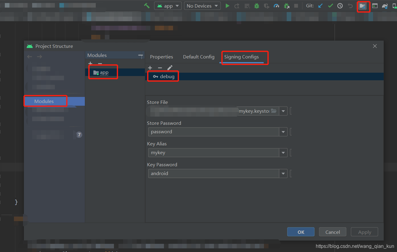 找到右上角图标project structure,依次配置即可。修改过名称及密码的,按照对应位置设置。